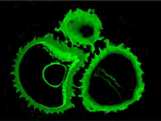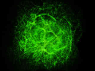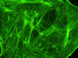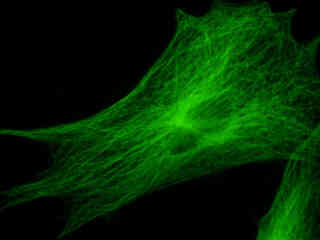 A culture of rat kangaroo (PtK2) epithelial cells that were immunofluorescently labeled with primary anti-bovine alpha-tubulin mouse monoclonal antibodies followed by goat anti-mouse Fab fragments conjugated to Alexa Fluor 488 is presented in Figure 2(e). Staining of the intracellular microtubule network that extends throughout the cytoplasm is very evident in the image. In addition, the specimen was simultaneously stained for the nuclear protein cdc6 (conjugated to Pacific Blue), and for F-actin with phalloidin conjugated to Alexa Fluor 568. Note the absence of signals from the blue (Pacific Blue) and red (Alexa Fluor 568) fluorophores, but the presence of intense green fluorescence from several of the more prominent tubulin cytoskeletal elements.