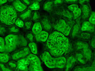 Fluorescence emission intensity from a thin section of mouse kidney stained with multiple fluorophores is displayed in Figure 2(d). Nuclei in the tissue section were targeted with the nucleic acid probe DAPI, which has an excitation maximum at 358 nanometers and an emission maximum at 461 nanometers when bound to DNA in cell cultures and tissue sections. In addition, the cryostat section was also simultaneously stained with Alexa Fluor 488 wheat germ agglutinin (glomeruli and convoluted tubules) and Alexa Fluor 568 phalloidin (filamentous actin and the brush border). Note the absence of signal from both the red (Alexa Fluor 568) and blue (DAPI) fluorophores.