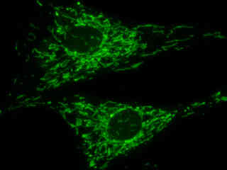Figures 2(b) and 2(c) illustrate Indian Muntjac deerskin fibroblast cells labeled with different staining regimens. The cells in Figure 2(b) were immunofluorescently labeled with primary anti-oxphos complex V inhibitor protein monoclonal antibodies (mouse) followed by goat anti-mouse Fab fragments conjugated to Alexa Fluor 488. The absorption maximum of Alexa Fluor 488 is 495 nanometers and the emission maximum occurs at 519 nanometers. In addition, the specimen was simultaneously stained for F-actin with Alexa Fluor 350 (blue) conjugated to phalloidin, and for DNA with SYTOX Orange. Note the absence of signal from both the blue and orange fluorophores, but the significant emission intensity from Alexa Fluor 488, which has efficiently labeled intracellular mitochondria. In many cases, SYTOX Orange stains a variety of cytoplasmic elements in addition to DNA, but this is not evident in the image.