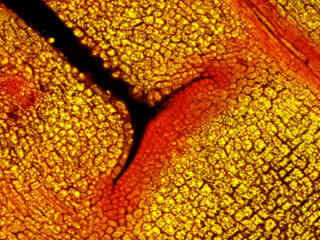 Autofluorescence emission intensity from a thin section of caster bean (Ricinus communis) tissue is illustrated in Figure 2(f). Endogenous autofluorescence in plant tissues arises from a variety of biomolecules, including chlorophyll, carotene, and xanthophyll. In the blue region, chlorophyll has an absorption band with a high extinction coefficient and produces a significant amount of fluorescence when excited with wavelengths between 420 and 460 nanometers. Note the presence of significant spectral bleed-through from autofluorescence emission in the yellow and red spectral regions with the B-2A filter combination.