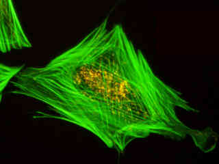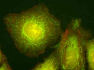 Illustrated in Figure 2(d) are HeLa epithelial cells that were immunofluorescently labeled with primary anti-oxphos complex V inhibitor protein monoclonal antibodies (mouse) followed by goat anti-mouse Fab fragments conjugated to Alexa Fluor 488. The absorption maximum of Alexa Fluor 488 is 495 nanometers and the emission maximum occurs at 519 nanometers. In addition, the specimen was simultaneously stained for F-actin with Alexa Fluor 568 (red) conjugated to phalloidin, and for DNA with 4',6-diamidino-2-phenylindole (DAPI). Note the presence of signal from both the red and green fluorophores, but the absence of any significant emission intensity from DAPI, which is not efficiently excited in the blue wavelength region.