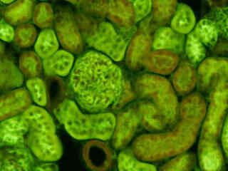 Fluorescence emission from a thin section of mouse kidney labeled with multiple (3) fluorophores is illustrated in Figure 2(b). Nuclei in the tissue section were targeted with the nucleic acid probe DAPI, which has an excitation maximum at 358 nanometers and an emission maximum at 461 nanometers when bound to DNA in cell cultures and tissue sections. In addition, the cryostat section was also simultaneously stained with Alexa Fluor 488 wheat germ agglutinin (glomeruli and convoluted tubules) and Alexa Fluor 568 phalloidin (filamentous actin and the brush border). Note the absence of signal from the blue (DAPI) fluorophore but the low level of red (Alexa Fluor 568) fluorescence bleed-through in many regions of the image.
