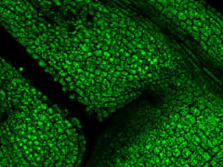The B-2E/C filter combination is specifically designed with a 30-nanometer excitation bandpass suitable for imaging specimens labeled with fluorescein isothiocyanate (FITC), and a number of other popular fluorophores used in multiple-labeling fluorescence techniques. The emission bandpass region is somewhat lower in wavelength than that of the B-1E and B-2E filter sets to provide optimum detection of popular fluorochromes such as FITC, BODIPY, Fluo-3, oxacarbocyanine dyes (DiO), and green fluorescent protein (GFP). In addition, the lowered emission filter bandpass results in improved blocking of yellow to red wavelengths, with only green fluorescence appearing in images acquired using the B-2E/Cfilter combination (See Figure 2). Among the Nikon blue-excitation filter sets, those in the E-series, in general, produce images with a much higher signal-to-noise ratio and darker background regions than do combinations with longpass emission filters.
