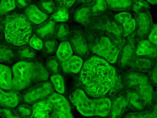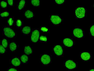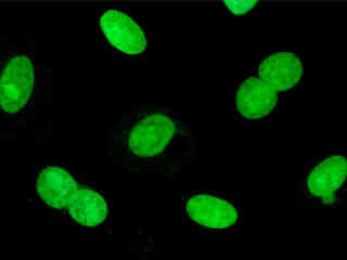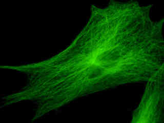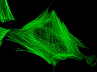 Figure 2(c) illustrates a culture of Indian Muntjac cells that were labeled with phalloidin conjugated to Alexa Fluor 488 for the intracellular actin cytoskeletal network. The specimen was simultaneously labeled with primary anti-human OxPhos Complex V inhibitor protein mouse monoclonal antibodies followed by goat anti-mouse Fab fragments conjugated to Alexa Fluor 555 (emission maximum at 571 nanometers). Nuclei were stained with the far-red fluorescent probe TO-PRO-3 (emission maximum at 661 nanometers). Note the absence of signals from the orange (Alexa Fluor 555) and far-red fluorophores, but the presence of intense green fluorescence from several of the more prominent actin cytoskeletal elements.