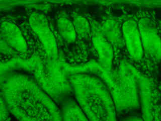 Presented in Figure 2(a) is the fluorescence emission intensity from a culture of rat kangaroo (PtK2) epithelial cells that were immunofluorescently labeled with primary anti-bovine alpha-tubulin mouse monoclonal antibodies followed by goat anti-mouse Fab fragments conjugated to Alexa Fluor 488. The absorption maximum of Alexa Fluor 488 is 495 nanometers and the emission maximum occurs at 519 nanometers. Note the prominent staining of the intracellular microtubule network that extends throughout the cytoplasm. Green fluorescence from the nuclei stained with SYTOX Green in a thin section of mouse intestine is illustrated in Figure 2(b). The specimen was also simultaneously stained with Alexa Fluor 568 phalloidin (filamentous actin; 600 nanometer emission) and Alexa Fluor 350 wheat germ agglutinin (mucus of goblet cells; 346 nanometer excitation and 442 nanometer emission). Note the presence of clean signal (low background) from the green fluorophore, but the absence of fluorescence intensity from the blue and red probes.