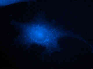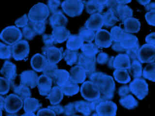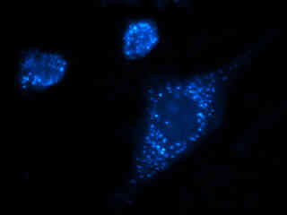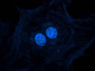 Presented in Figure 2(a) is the fluorescence emission intensity from a culture of rat thoracic aorta (muscle) cells that were immunofluorescently labeled with primary anti-oxphos complex V inhibitor protein monoclonal antibodies (mouse) followed by goat anti-mouse Fab fragments conjugated to Pacific Blue. The absorption maximum of Pacific Blue is 410 nanometers and the emission maximum occurs at 455 nanometers. In addition, the specimen was simultaneously stained for F-actin with Alexa Fluor 488 (green) conjugated to phalloidin, and for DNA with SYTOX Orange. Note the absence of signal from both the orange and green fluorophores (SYTOX localized in the nucleus would appear green under these observation conditions). In many cases, SYTOX Orange stains a variety of cytoplasmic elements in addition to DNA, although this is not evident in the image.