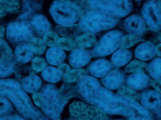 Nuclei in a mouse kidney thin tissue section (Figure 2(d)) were targeted with the nucleic acid probe DAPI, which has an excitation maximum at 358 nanometers and an emission maximum at 461 nanometers when bound to DNA in cell cultures and tissue sections. In addition, the cryostat section in Figure 2(d) was also simultaneously stained with Alexa Fluor 488 wheat germ agglutinin (glomeruli and convoluted tubules) and Alexa Fluor 568 phalloidin (filamentous actin and the brush border). Note the absence of signal from the red (Alexa Fluor 568) fluorophore, but the significant amount of bleed-through into the cyan emission filter from the green (Alexa Fluor 488) probe. With an ultraviolet excitation bandpass emission filter set, the darker nuclei in the specimen would appear bright blue and the signal from Alexa Fluor 488 would be largely absent.