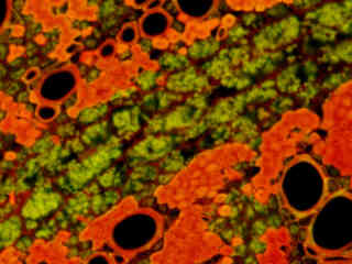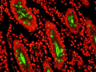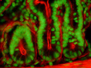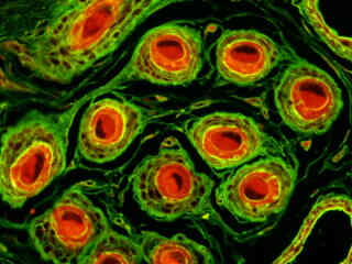A thin section of sheep epidermal skin tissue stained for DNA and glycoproteins with SYTOX Orange and Oregon Green 488 wheat germ agglutinin, respectively, is presented in Figure 2(b). The absorption maximum of SYTOX Orange is 547 nanometers and the emission maximum occurs at 570 nanometers, while the corresponding values for Oregon Green 488 are 496 and 524 nanometers. In addition, the specimen was simultaneously stained with Alexa Fluor 350 conjugated to phalloidin (targeting the actin network; blue emission). Note the absence of signal from the blue (Alexa Fluor 350) fluorophore, but the bright orange-red fluorescence exhibited by the nuclei and the green emission from glycoproteins in the cytoplasm and membrane components of the hair follicles.