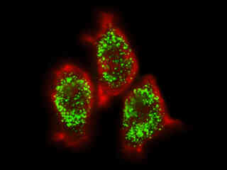 Figure 2(d) demonstrates the fluorescence emission from a culture of HeLa carcinoma cells transfected with an EGFP-peroxisomal targeting signal 1 (PTS1) fusion protein and stained with Alexa Fluor 546-phalloidin. These fluorescent probes target the peroxisomes and cytoskeletal actin filament network, respectively. The absorption maximum of the EGFP-PTS1 chimera is 488 nanometers and the emission maximum occurs at 507 nanometers, while the corresponding values for Alexa Fluor 546 are 556 and 573 nanometers. In addition, the specimen was simultaneously stained with Hoechst 33258 (targeting the DNA in the nucleus; blue emission). Note the absence of signal from the blue fluorophore, but the bright orange-red fluorescence exhibited by the cytoskeletal actin filaments and the intense green emission from peroxisomes in the cytoplasm.