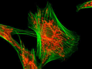 Illustrated in Figure 2(a) is the fluorescence emission from a culture of Madin-Darby canine kidney (MDCK line) cells stained with MitoTracker Red CMXRos and Alexa Fluor 488-phalloidin, which target the intracellular mitochondrial network and cytoskeletal actin filaments, respectively. The absorption maximum of MitoTracker Red CMXRos is 579 nanometers and the emission maximum occurs at 599 nanometers, while the corresponding values for Alexa Fluor 488 are 498 and 519 nanometers. In addition, the specimen was simultaneously stained with DAPI (targeting DNA in the cell nucleus; blue emission). Note the absence of signal from the blue (DAPI) fluorophore, but the bright orange-red fluorescence exhibited by the tubular mitochondria and the green emission from actin filaments in the cytoplasm.