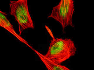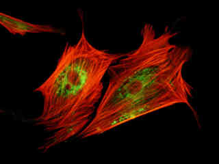 Fluorescence emission in a culture of Indian Muntjac deerskin fibroblast cells stained with Alexa Fluor 568 conjugated to phalloidin and LysoTracker Green DND-26, which target intracellular actin and lysosomes, respectively, are displayed in Figure 2(c). The absorption maximum of Alexa Fluor 568 is 578 nanometers and the emission maximum occurs at 603 nanometers, while the corresponding values for LysoTracker Green DND-26 are 501 and 511 nanometers. In addition, the specimen was simultaneously stained with DAPI (targeting DNA in the cell nucleus; excitation at 358 nanometers and emission at 461 nanometers). Note the absence of signal from the blue fluorophore (DAPI), but the presence of bright green and orange-red fluorescence exhibited by the lysosomes and actin filaments in the cytoskeletal network.