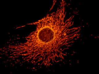 Illustrated in Figure 2(a) is the fluorescence emission intensity from a culture of bovine pulmonary artery endothelial cells stained with MitoTracker Red CMXRos, which targets the intracellular mitochondrial network. The absorption maximum of MitoTracker Red CMXRos is 579 nanometers and the emission maximum occurs at 599 nanometers. In addition, the specimen was simultaneously stained with DAPI (targeting DNA in the cell nucleus; blue emission) and BODIPY FL-phallacidin (targeting actin; green emission). Note the absence of signal from the blue (DAPI) and green (BODIPY) fluorophores, but the bright yellow-orange fluorescence exhibited by the tubular mitochondria.