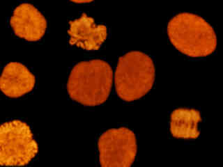Presented in Figure 2(d) are HeLa cells immunofluorescently labeled with primary anti-histone (pan) mouse monoclonal antibodies followed by goat anti-mouse Fab fragments conjugated to Alexa Fluor 546. The absorption maximum of Alexa Fluor 546 is 556 nanometers and the emission maximum occurs at 573 nanometers (in the yellow region of the visible light spectrum). The primary antibody, produced from purified nuclear fractions of HeLa cells, binds specifically to an antigen determinant that is present on all five histone proteins (H1, H2A, H2B, H3, and H4). Note the strong yellow-orange fluorescence intensity from the cells undergoing mitosis, but the reduced emission intensity of interphase nuclei.