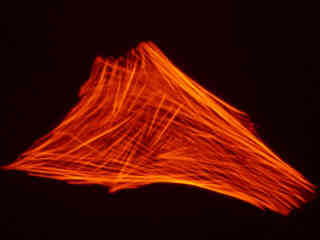 A culture of Indian Muntjac deerskin fibroblast cells stained with Alexa Fluor 568 conjugated to phalloidin, which binds to the intracellular filamentous actin network, is presented in Figure 2(b). The absorption maximum of Alexa Fluor 568 is 578 nanometers and the emission maximum occurs at 603 nanometers in the orange region of the spectrum. In addition, the specimen was simultaneously stained with DAPI (targeting DNA in the cell nucleus; blue emission) and MitoTracker Green FM (targeting mitochondria; green emission). Note the absence of signal from the green (MitoTracker) and blue (DAPI) fluorophores, which are not efficiently excited at green wavelengths, but the bright orange-red fluorescence exhibited by the actin filaments.