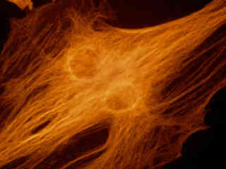 A pair of daughter rat kangaroo (PtK2) epithelial cells, illustrated in Figure 2(e), were among those in a culture that was immunofluorescently labeled with primary anti-bovine alpha-tubulin mouse monoclonal antibodies followed by goat anti-mouse Fab fragments conjugated to Alexa Fluor 546. The absorption maximum of Alexa Fluor 546 is 556 nanometers and the emission maximum occurs at 573 nanometers (in the yellow region of the visible light spectrum). Note the prominent yellow-orange staining of the intracellular microtubule network that extends throughout the cytoplasm.