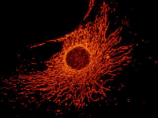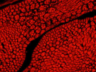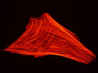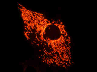 A culture of bovine pulmonary artery endothelial cells stained with MitoTracker Red CMXRos, which targets the intracellular mitochondrial network, is shown in Figure 2(b). The absorption maximum of MitoTracker Red CMXRos is 579 nanometers and the emission maximum occurs at 599 nanometers. In addition, the specimen was simultaneously stained with DAPI (targeting DNA in the cell nucleus; blue emission) and BODIPY FL-phallacidin (targeting actin; green emission). Note the absence of signal from the blue (DAPI) and green (BODIPY) fluorophores, but the bright yellow-orange fluorescence exhibited by the tubular mitochondria.