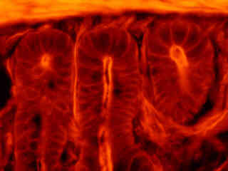 Figure 2(c) presents a thin section of mouse intestine stained with Alexa Fluor 350 wheat germ agglutinin, a blue fluorescent lectin that is specific to the mucus of goblet cells. In addition, the specimen was simultaneously stained with Alexa Fluor 568 phalloidin (filamentous actin; 600 nanometer emission) and SYTOX Green (nuclei; 504 nanometer excitation and 523 nanometer emission). Note the low level of background noise in comparison to the other Nikon longpass filter combinations (G-2A and G-2B), and the significant amount of yellow-red signal arising from Alexa Fluor 568 that appears in the image.