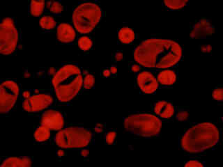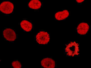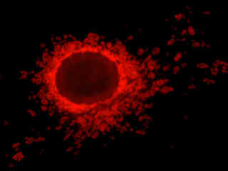 Presented in Figure 2(a) is the fluorescence emission from a culture of African green monkey (COS-1 line) cells stained with MitoTracker Red CMXRos, which targets the intracellular mitochondrial network. The absorption maximum of MitoTracker Red CMXRos is 579 nanometers and the emission maximum occurs at 599 nanometers. In addition, the specimen was simultaneously stained with DAPI (targeting DNA in the cell nucleus; blue emission) and Alexa Fluor 488 conjugated to phalloidin (targeting actin; green emission). Note the absence of signal from the blue DAPI and green fluorophores, but the bright orange-red fluorescence exhibited by the disc-shaped mitochondria.