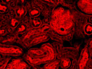 A thin section of mouse kidney stained with multiple (3) fluorophores is illustrated in Figure 2(b). Nuclei in the tissue section were targeted with the nucleic acid probe DAPI, which has an excitation maximum at 358 nanometers and an emission maximum at 461 nanometers when bound to DNA in cell cultures and tissue sections. In addition, the cryostat section was also simultaneously stained with Alexa Fluor 488 wheat germ agglutinin (glomeruli and convoluted tubules) and Alexa Fluor 568 phalloidin (filamentous actin and the brush border). Note the absence of signal from both the blue (DAPI) and green (Alexa Fluor 488) probes, but the intense red fluorescence due to the presence of Alexa Fluor 568 in the actin and brush border networks.