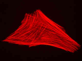 Fluorescence emission is illustrated in Figure 2(e) from a culture of Indian Muntjac deerskin fibroblast cells stained with Alexa Fluor 532 conjugated to phalloidin, which binds to the intracellular filamentous actin network. The absorption maximum of Alexa Fluor 532 is 531 nanometers and the emission maximum occurs at 554 nanometers in the green-yellow region of the spectrum. In addition, the specimen was simultaneously stained with DAPI (targeting DNA in the cell nucleus; blue emission) and MitoTracker Green FM (targeting mitochondria; green emission). Note the absence of signal from the green (MitoTracker) and blue (DAPI) fluorophores, which are not efficiently excited at green wavelengths, but the bright orange-red fluorescence exhibited by the actin filaments.
