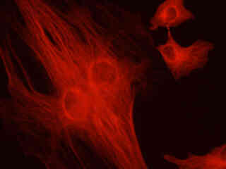 Fluorescence emission intensity from a culture of rat kangaroo (PtK2) epithelial cells that were immunofluorescently labeled with primary anti-bovine alpha-tubulin mouse monoclonal antibodies followed by goat anti-mouse Fab fragments conjugated to Alexa Fluor 546 is demonstrated in Figure 2(c). The absorption maximum of Alexa Fluor 546 is 556 nanometers and the emission maximum occurs at 573 nanometers (in the yellow region of the visible light spectrum). Note the prominent red staining of the intracellular microtubule network that extends throughout the cytoplasm.