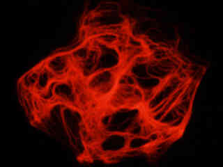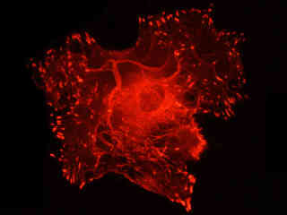 Figure 2(d) illustrates a culture of albino Swiss mouse embryo cells (3T3 line) that were immunofluorescently labeled with primary anti-vinculin mouse monoclonal antibodies followed by goat anti-mouse Fab fragments conjugated to Cy3. The visible light absorption maximum of Cy3 is 552 nanometers and the emission maximum occurs at 570 nanometers. Note the prominent staining of the cellular attachment network in the central portion and periphery of these cells. In addition, the specimen was simultaneously stained for DNA with the ultraviolet-absorbing probe DAPI, and for the cytoskeletal filamentous actin network with Alexa Fluor 488 conjugated to phalloidin.
