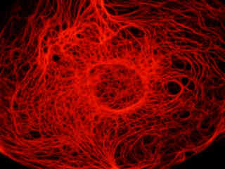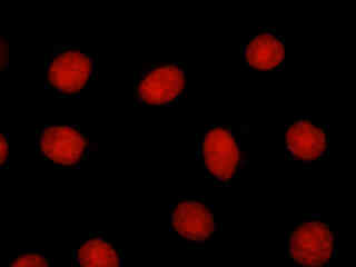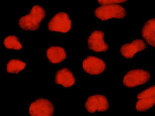 A culture of rat kangaroo kidney epithelial cells (PtK2 line) that were immunofluorescently labeled with primary anti-tubulin (bovine) mouse monoclonal antibodies followed by goat anti-mouse Fab fragments conjugated to tetramethylrhodamine (TMR), is presented in Figure 2(b). The visible light absorption maximum of TMR is 550 nanometers and the emission maximum occurs at 573 nanometers. In addition, the specimen was stained with DAPI (targeting DNA in the nucleus; ultraviolet excitation and blue emission), but this fluorophore is not imaged with the Nikon TRITC HYQ filter combination. Note the bright fluorescence intensity exhibited by the microtubule network, which extends throughout the cytoplasm in these epithelial cells.