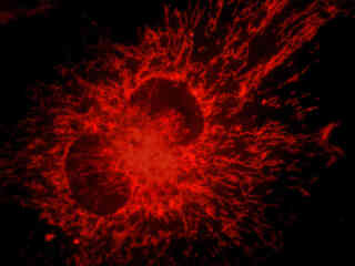 Fluorescence emission intensity from a culture of normal African green monkey kidney epithelial cells (CV-1 line) stained with MitoTracker Red CMXRos, which targets the intracellular mitochondrial network, is demonstrated in Figure 2(c). The visible light absorption maximum of MitoTracker Red CMXRos is 579 nanometers and the emission maximum occurs at 599 nanometers. In addition, the specimen was labeled with Alexa Fluor 488 conjugated to phalloidin (binding to F-actin; green emission) and DAPI (staining DNA in the nucleus; blue emission). Note the bright fluorescence intensity exhibited by the tubular mitochondrial network, but the absence of signal from the blue and green fluorophores.