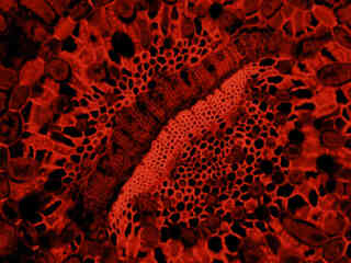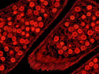 Autofluorescence emission from a horsetail fern (Equisetum arvense) mature strobilus thin section is demonstrated in Figure 2(f). Endogenous autofluorescence in plant tissues arises from a variety of biomolecules, including chlorophyll, carotene, and xanthophyll. In the green excitation region, chlorophyll has an absorption band with a low extinction coefficient, but still produces a detectable level of fluorescence at emission wavelengths of 550 nanometers and above (green, yellow, orange, and red). For the fern reproductive tissue illustrated above, note the presence of autofluorescence emission intensity in the orange and red spectral regions, which is strongly reminiscent of a darkfield image.