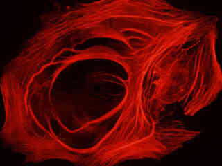 Illustrated in Figure 2(a) is the fluorescence emission observed in a culture of canine kidney epithelial (Madin-Darby; MDCK line) cells stained with phalloidin conjugated to Alexa Fluor 568, which targets the intracellular cytoskeletal F-actin network. The visible light absorption maximum of Alexa Fluor 568 is 578 nanometers and the emission maximum occurs at 603 nanometers. Note the bright fluorescence signal exhibited by the filamentous actin network, which extends throughout the cytoplasm. In addition to phalloidin, the specimen was also labeled with wheat germ agglutinin conjugated to Oregon Green 488 (targeting the Golgi network; blue excitation and green emission) and DAPI (staining DNA in the nucleus; ultraviolet excitation and blue emission). Neither of these fluorophores are imaged with the Nikon TRITC HYQ filter combination.