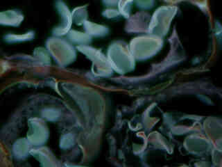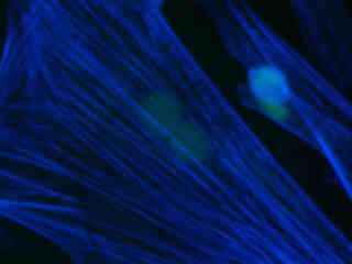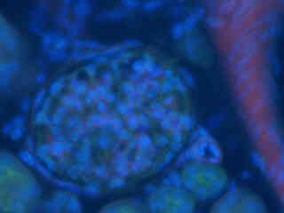 Figure 2(c) illustrates culture of Indian Muntjac deerskin fibroblasts stained with Hoechst 33258, which specifically binds to DNA and stains the nuclei. The ultraviolet absorption maximum of Hoechst 33258 is 346 nanometers and the emission maximum is centered at 460 nanometers. Autofluorescence in plant tissues (fern sporangium) is represented in Figure 2(f) and demonstrates the wide emission spectrum of endogenous fluorophores in these specimens. Note that images captured with the UV-1A filter combination have less contrast than images from the UV-2E/C set and less emission intensity than related combinations in the UV-2A and UV-2B filter blocks.