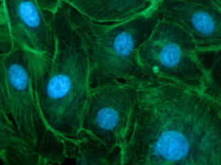 The UV-1A fluorescence filter combination is designed to minimize autofluorescence partially by utilizing only the i-line region of the mercury ultraviolet emission spectrum (centered at 365 nanometers). Consequently, this filter combination is recommended primarily for microscopes equipped with a mercury arc-discharge lamp. The longpass emission (barrier) filter used in the UV-1A combination is designed to collect signals at wavelengths exceeding 420 nanometers, enabling visualization of red, orange, yellow, green, and blue emission from fluorophores excited in the ultraviolet. The UV-1A filter combination is recommended when studying the following fluorophores: 7-amino-4-methylcoumarin-3-acetic acid (AMCA), anthroyl stearate, bisbenzamide, Calcein Blue, Cascade Blue, 4',6-diamidino-2-phenylindole (DAPI), FluoroGold, and Hoechst 33342/33258, among many others. The images presented in Figure 2 demonstrate the performance of this filter combination with a variety of ultraviolet absorbing fluorescence probes targeted at different intracellular locations.