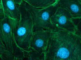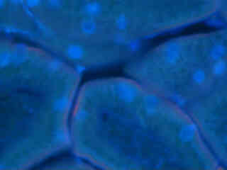 Figure 2(b) illustrates a culture of Indian Muntjac deerskin fibroblasts stained with Hoechst 33258, which specifically binds to DNA and stains the nuclei. The ultraviolet absorption maximum of Hoechst 33258 is 346 nanometers and the emission maximum is centered at 460 nanometers. Figures 2(c) and 2(d) present a mouse kidney thin section and bovine pulmonary artery cultured cells, respectively, both having the nuclei stained with DAPI (excitation at 358 nanometers and emission at 461 nanometers). Fluorescence emission centered at 422 nanometers from LysoTracker Blue DND-22, an ultraviolet probe that targets lysosomes, is presented in Figure 2(e).