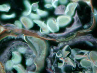 Autofluorescence in plant tissues (fern sporangium) is represented in Figure 2(f) and demonstrates the wide emission spectrum of endogenous fluorophores in these specimens. Note that images captured with the UV-2B filter combination have less contrast than images from the UV-2E/C set, but greater contrast and darker backgrounds than the related combination in the UV-2A filter block.