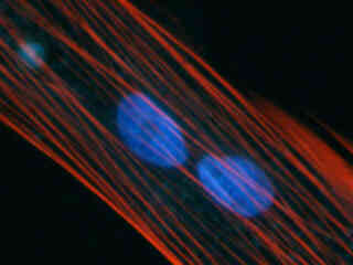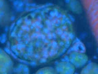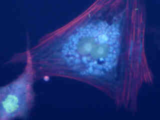 The UV-2B fluorescence filter combination is designed to provide all-purpose imaging of fluorescent specimens with ultraviolet excitation, and is similar in filter profiles to the standard set (UV-2A) for this spectral region. The 50-nanometer bandpass excitation filter covers the longer ultraviolet wavelengths and is capable of exciting many of the fluorophores that have marginal absorption in this region. The longpass emission (barrier) filter used in the UV-2Bcombination is designed to collect signals at wavelengths exceeding 435 nanometers, enabling visualization of red and green emission from fluorophores excited in the ultraviolet, but providing a darker background and better contrast than the UV-2A filter combination. The UV-2B filter combination is recommended when studying the following fluorophores: 7-amino-4-methylcoumarin (AMC), and its acetic acid derivatives (AMCA-S and AMCA), aminoquinoline, Aniline Blue, anthroyl stearate, bisaminophenyloxadiazole (BAO 9), bisbenzamide, Calcein Blue, Cascade Blue, dansyl derivatives, 4'-6-diamidino-2-phenylindole (DAPI), dopamine, Fast Blue, FluoroGold, Hoechst 33258/33342, noradrenaline, Nuclear Yellow, pyrene, tetracycline, and True Blue. The images presented in Figure 2 demonstrate the performance of the UV-2B filter combination with a variety of ultraviolet absorbing fluorescence probes targeted at different intracellular locations.