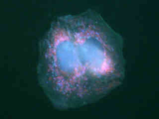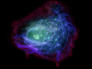 Illustrated in Figure 2(a) is a pair of rat skeletal muscle (myocytes) daughter cells that were immunofluorescently labeled with primary anti-human cdc6 (a nuclear protein) mouse monoclonal antibodies followed by goat anti-mouse Fab fragments conjugated to Marina Blue. The specimen was simultaneously stained for F-actin with Alexa Fluor 488 (green) conjugated to phalloidin, and for mitochondria with MitoTracker Red CMXRos. Note the weak signal from Marina Blue (the fluorophore is not particularly efficient for violet excitation) and the presence of signal from both the red and green fluorophores.