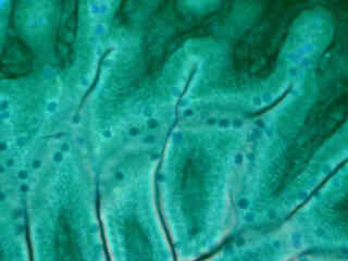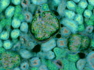 Illustrated in Figure 2(e) is the fluorescence emission intensity from a thin section of mouse kidney stained with DAPI, Alexa Fluor 488 wheat germ agglutinin, a green fluorescent lectin that is specific to the glomeruli and convoluted tubules. The absorption maximum of DAPI is 358 nanometers and the emission maximum is 461 nanometers. In addition, the specimen was simultaneously stained with Alexa Fluor 568 phalloidin (filamentous actin). Note the presence of spectral bleed-through from the red and green fluorophores, which appears throughout the image.