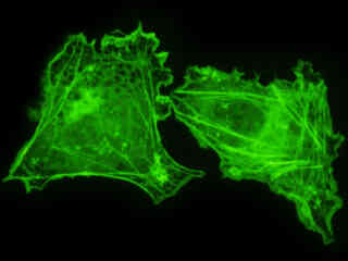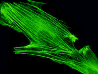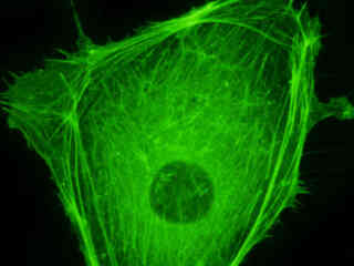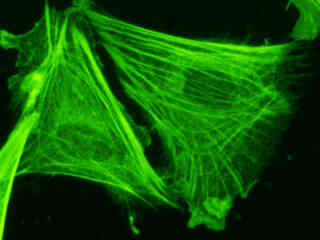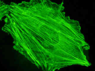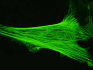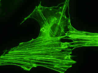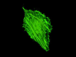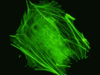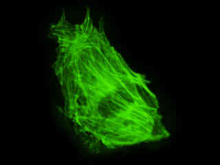 Examine the fluorescence emission intensity from a culture of albino Swiss mouse embryonic fibroblast (3T3 line) cells that were transfected with a pEYFP-Actin plasmid subcellular localization vector. Note the complex two and three-dimensional network of actin filaments and stress fibers that extend throughout the cytoplasm and inhabit the cortex in this cell line.