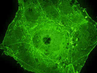 Observe the fluorescence emission in a culture of normal Indian Muntjac deer skin fibroblast cells that were transfected with a pEYFP-Actin plasmid subcellular localization vector. The enhanced yellow fluorescent protein gene used in these studies contains several important amino acid substitutions that shift the emission maximum of green fluorescent protein (GFP) by approximately 18 nanometers, from 509 to 527 nanometers.