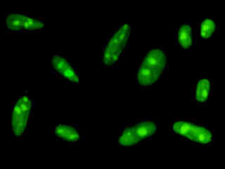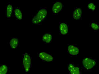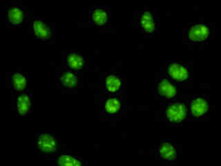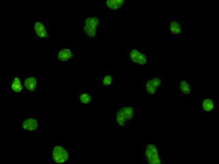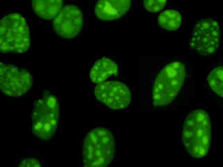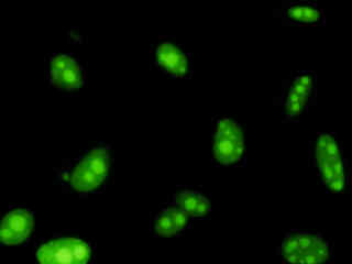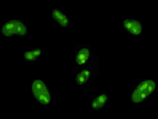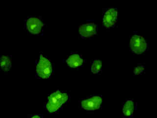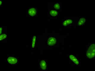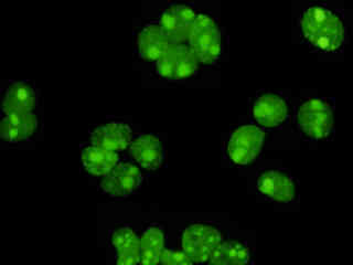 Examine human cervical adenocarcinoma (HeLa line) epithelial cells that were transfected with a pEYFP-Nucleus plasmid subcellular localization vector. The enhanced yellow fluorescent protein gene used in these studies contains several important amino acid substitutions that shift the emission maximum from 509 to 527 nanometers. However, the fluorescence emission still appears green when observed in the microscope eyepieces.