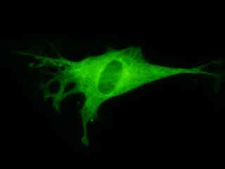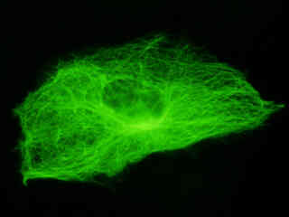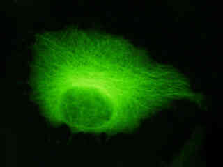 Microtubules are cylindrical biopolymeric filaments that play an important structural and functional role in the dynamics of the cellular cytoskeleton. These hollow, but rigid, helical tubes are constructed with several variations of a protein known as tubulin. Among the many biological tasks assigned to microtubules is segregation of the chromosomes during mitosis, formation of cilia and flagella on the surface of a cell, and transport of materials through axons. Recombinant plasmids have been constructed that contain a fusion protein consisting of the yellow-green variant (referred to as enhanced yellow fluorescent protein; EYFP) of the Aequorea victoria green fluorescent protein (GFP) coupled to human alpha-tubulin, one of the tubulin subunits in microtubules. Upon transcription and translation of the plasmid in transfected mammalian hosts, the fused tubulin domain is responsible for transport and distribution of the fluorescent protein chimera throughout the cellular microtubule network.